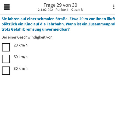 Und dabei jemanden behindert. Etwa 20 m vor Ihnen läuft plötzlich ein Kind auf die Fahrbahn. Bei einer Geschwindigkeit von 1 50 kmh 2 30 kmh 3 20 kmh.